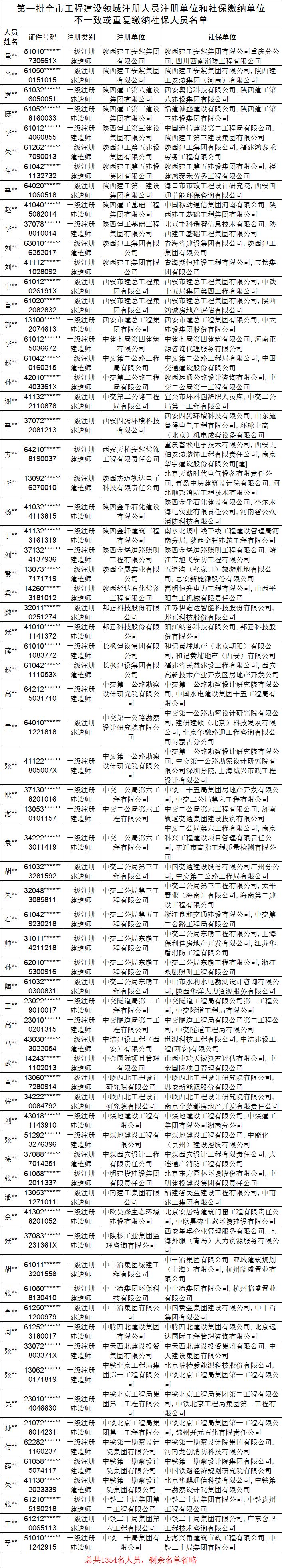 近日,陕西省西安市住房和城乡建设委员会公布了《第一批全市工程建设领域注册人员注册单位和社保缴纳单位不一致或重复缴纳社保人员名单》,共1354名人员,其中一建注册建造师952人、一级临时建造师15人、监理工程师387人。